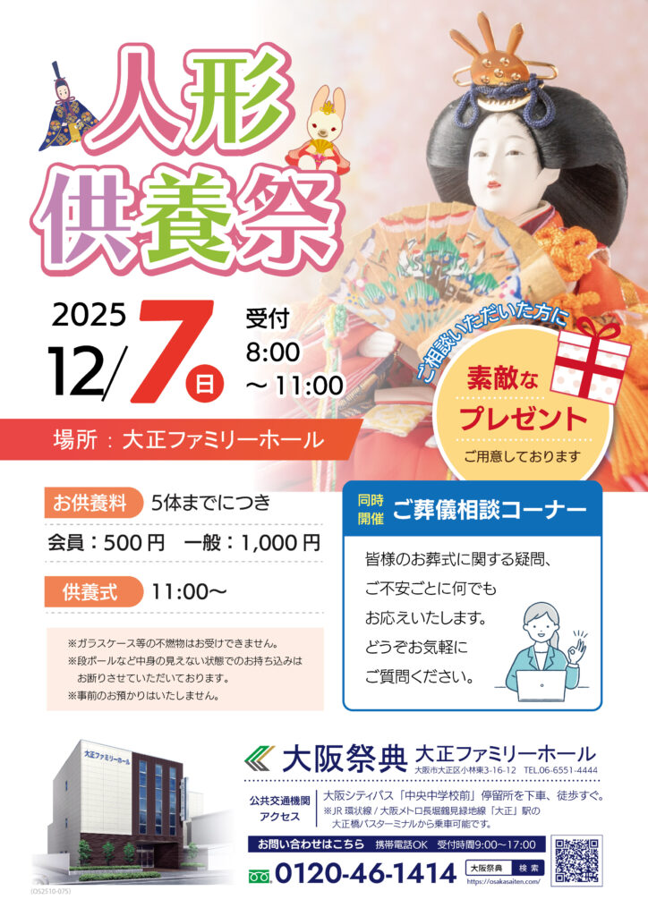 大正ファミリーホールにて人形供養祭を開催いたします。