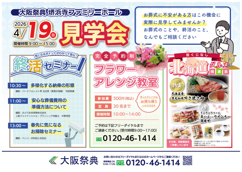 当日は祭壇の展示やお葬式の相談お見積りコーナーのほか、終活セミナーなども実施予定です。お葬式に不安がある方もそうでない方もどうぞお気軽にご参加ください。